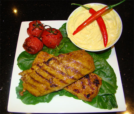 Put spicy rub (recipe below) over lamb and marinate for minimum two hours. Then place on heated and oiled grill pan and sear each side for 2-4 minutes then rest in tin foil for at least 10 minutes.