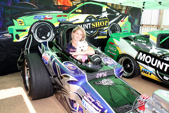 Stacey Price and her co-pilot friend Bella, a Japanese Spitz, in the cockpit of the dragster Stacey drives.