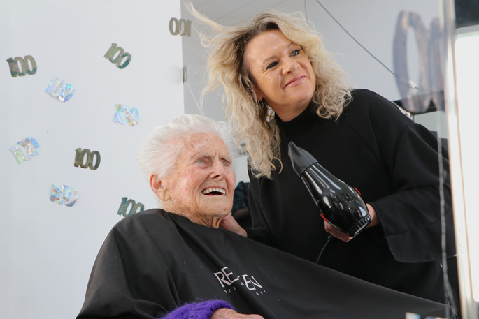 With the help of her daughter Shelley, Margaret is wheeled into Salon One in Fraser Cove for her 100th birthday blow wave and cut.