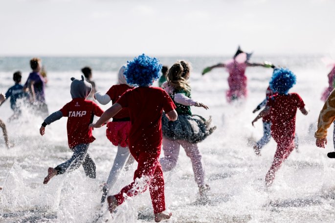 Brave participants take the icy leap at the Pāpāmoa Polar Plunge, celebrating winter with costumes, community spirit, and plenty of laughs. Photo / supplied.